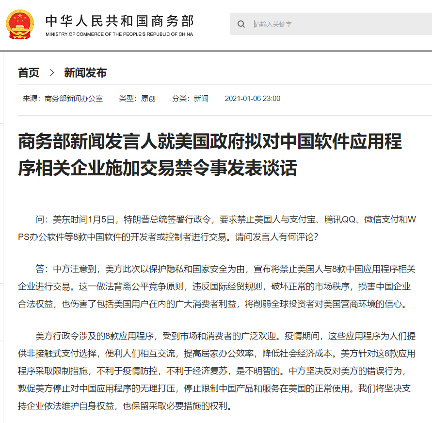 问:美东时间1月5日,特朗普总统签署行政令,要求禁止美国人与支付宝、腾讯QQ、微信支付和WPS办公软件等8款中国软件的开发者或控制者进行交易。请问发言人有何评论?