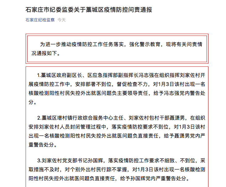 1、藁城区政府副区长、区应急指挥部副指挥长冯志强在组织指挥刘家佐村开展疫情防控工作中,安排部署不到位,督促检查不力,对1月3日该村出现一名核酸检测阳性村民失控外出就医问题负主要领导责任,给予冯志强党内警告处分。