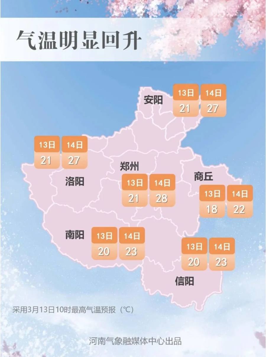 13日下午到明天,全省晴天间多云。14日全省大部最高气温回升至25度左右。