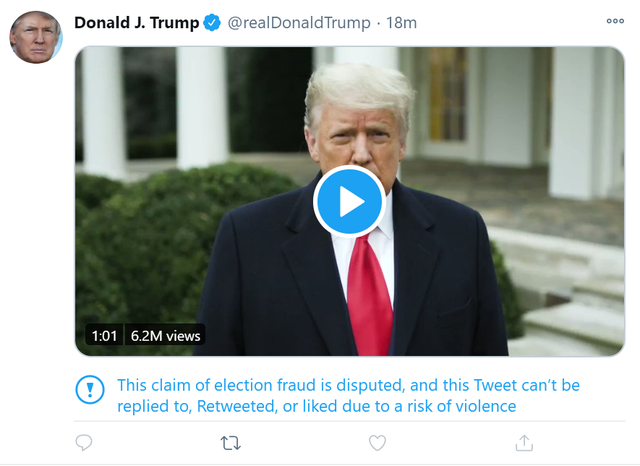 不过,推特很快对包含这段视频的推文进行了标记,称“这条宣称选举舞弊的推文具有争议,由于存在暴力因素的风险,这条推特无法回复、转发或点赞。”