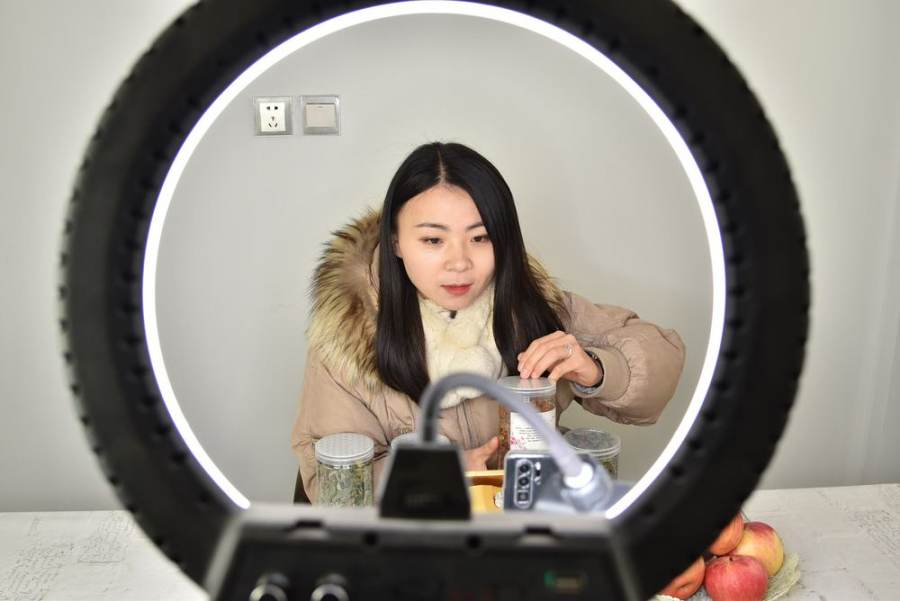2020年12月29日,一位创业者在山东省平邑县地方镇电子商务服务中心直播销售当地特色农产品。(新华社记者 杨文 摄)