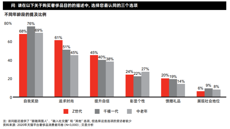 值得注意的是,报告显示,2020年1月到10月,出生于1995年以后的“Z世代”对奢侈品联名款和限量款的消费额同比增长了300%至400%。“自我奖励”和“追求时尚”是他们购买奢侈品的主因,同时他们也更偏爱小众设计款和联名款。