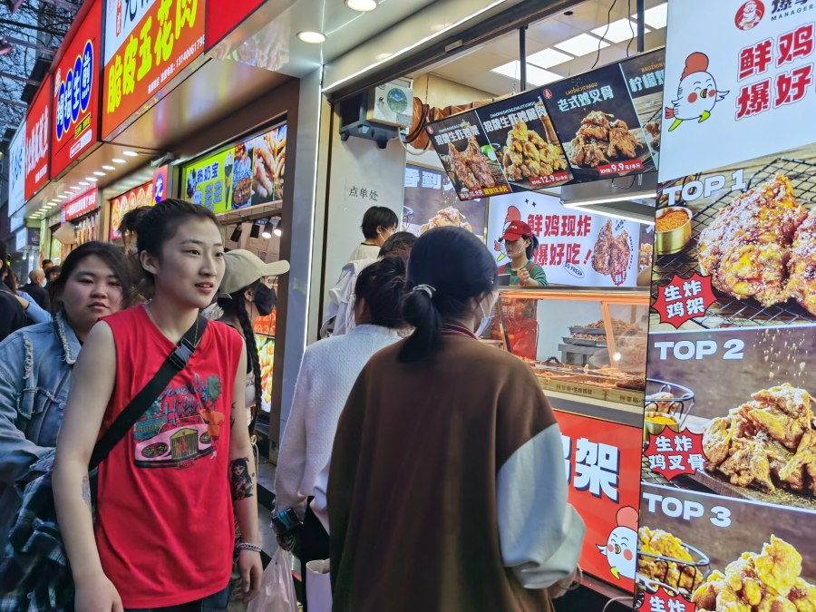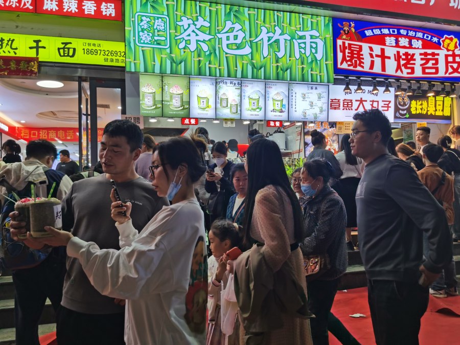 “天气回暖了,晚上下班后,和两三好友一起出来逛逛,吃吃喝喝、拍照打卡,每个步行街人都特别多,比白天还热闹。”左手一杯奶茶,右手一串面筋的小陈显得很是轻松惬意。