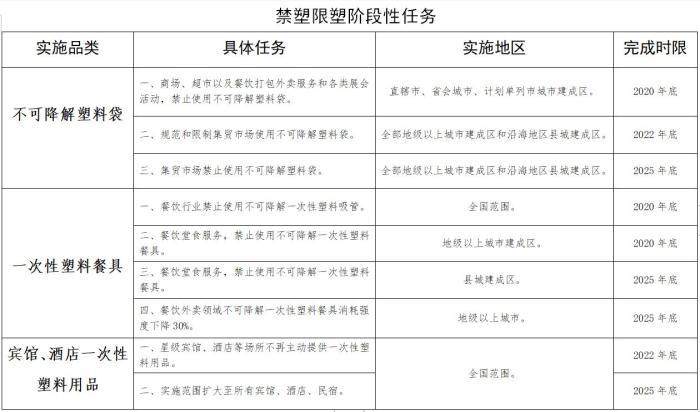 2020年8月,商务部办公厅发布关于进一步加强商务领域塑料污染治理工作的通知,公布禁塑限塑阶段性任务,要求到2020年底,直辖市、省会城市、计划单列市城市建成区的商场、超市以及餐饮打包外卖服务和各类展会活动禁止使用不可降解塑料袋,等等。