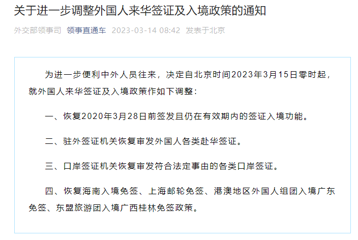 领事直通车消息,为进一步便利中外人员往来,决定自北京时间2023年3月15日零时起,就外国人来华签证及入境政策作如下调整: