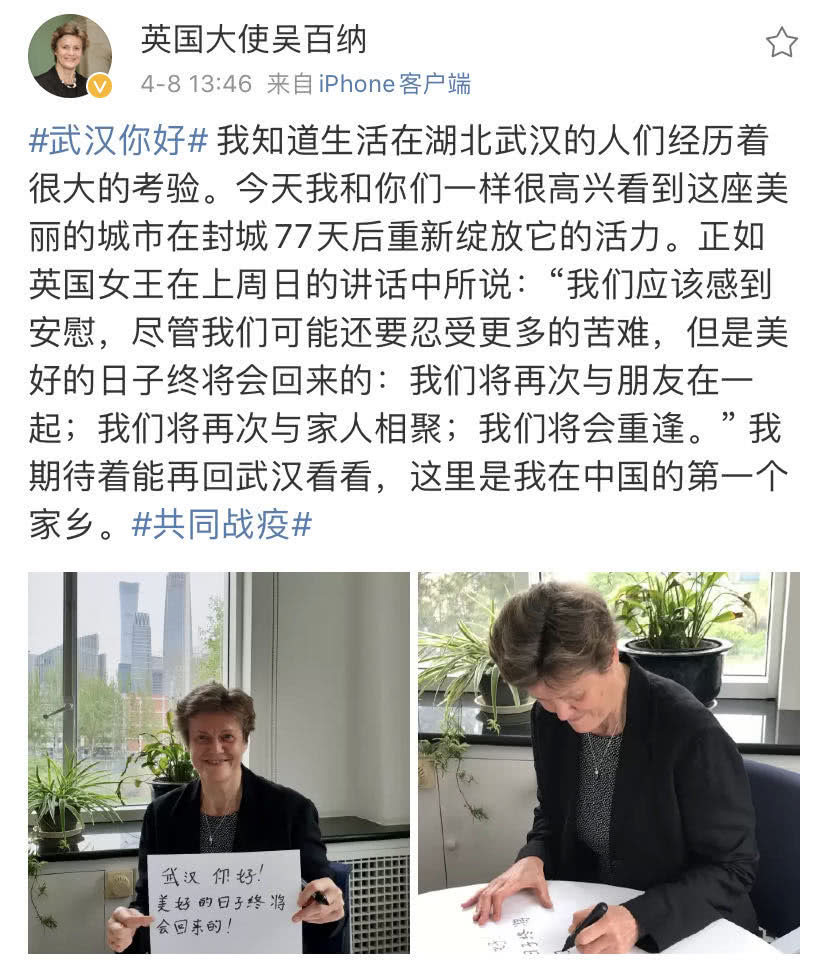 除热衷于起中文名外,一些驻华大使还认真学习中文、在中国的社交平台上和网友互动,与中国的缘分越来越深。“武汉你好!美好的日子终将会回来的!”2020年4月,武汉解封之时,前英国驻华大使吴百纳用汉字写下对武汉的祝福,得到无数中国网友称赞。
