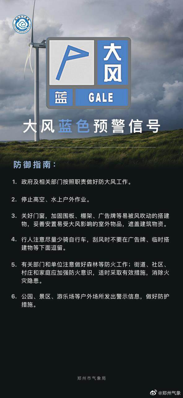 郑州市气象台2023年03月14日20时00分发布大风蓝色预警信号:预计14日夜里到15日白天,郑州市主城区、航空港区、上街区有4到5级偏北风,阵风7级左右。请注意防范大风天气带来的不利影响。