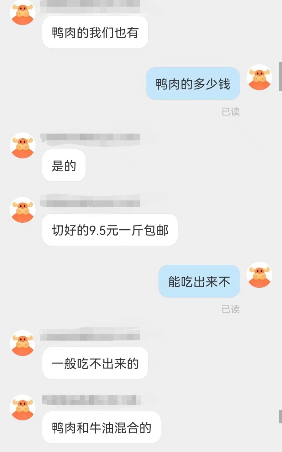 电商一商家销售混合牛油的鸭肉卷,并称用作红油火锅“一般吃不出来”。 对话截图