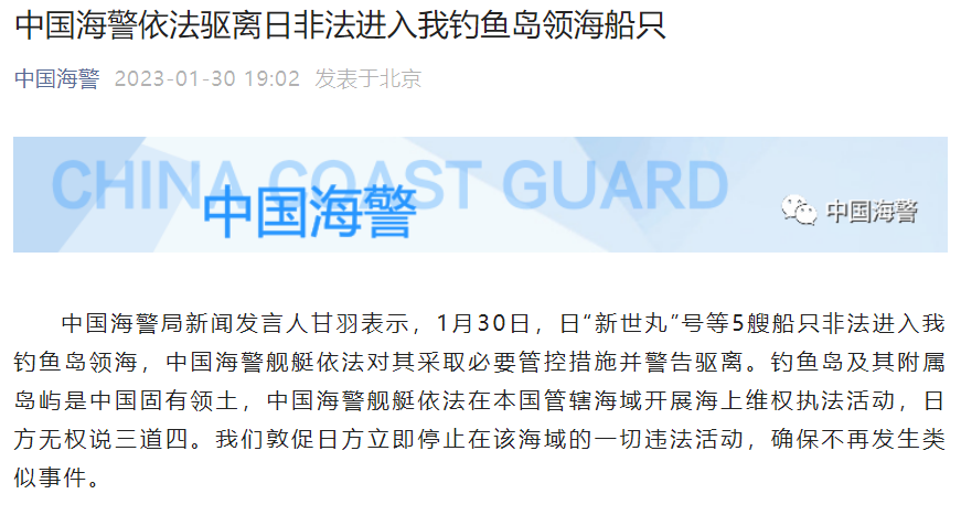 中国海警局新闻发言人甘羽表示,3月15日,中国海警舰艇进入钓鱼岛领海进行正常维权巡航,这是我捍卫国家主权和海洋权益的例行性举措,是对日方1艘游艇和数艘巡视船侵入我领海的有力反制。钓鱼岛及其附属岛屿是中国固有领土,日方的不实言论和相关报道严重歪曲历史事实。我们奉劝日方正视历史、尊重事实,多做有利于改善中日关系的事。