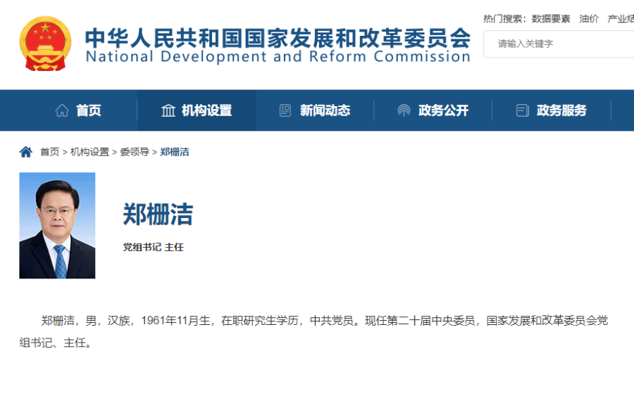 据国家发改委网站更新显示,郑栅洁现任第二十届中央委员,国家发展和改革委员会党组书记、主任。