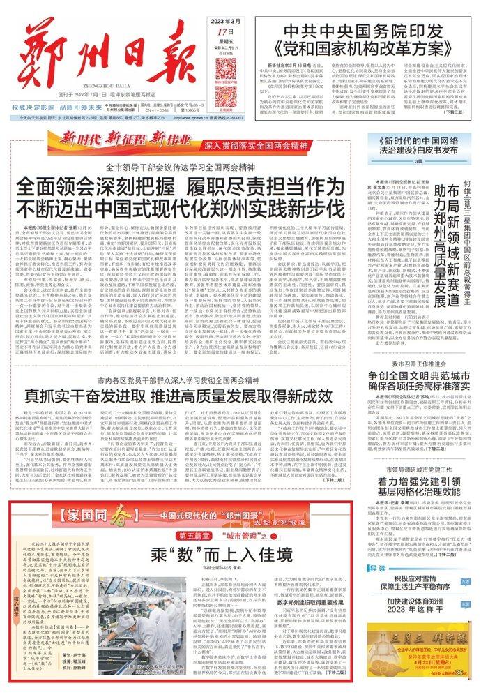 党的二十大报告阐明了中国式现代化的丰富内涵,强调了中国式现代化的本质要求、重要特征。今年是全面贯彻落实党的二十大精神开局之年,也是实施“十四五”规划承上启下的关键之年。当前,全市上下正在深入贯彻党的二十大和中央经济工作会议精神,以“当好国家队、提升国际化、引领现代化河南建设”为总目标,全面开展“三标”活动、深入推进“十大战略”行动,加快“四高地、一枢纽、一重地、一中心”和郑州都市圈建设,以风雨兼程的精神状态和一往无前的奋斗姿态,全力以赴拼经济,千方百计促发展,奋力谱写中原更加出彩的郑州篇章。