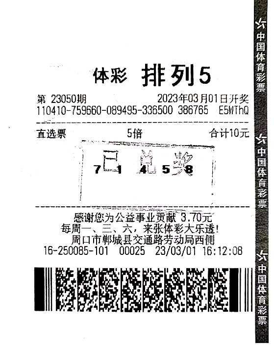 3月1日,体彩排列5第23050期开出号码“7 1 4 5 8”,周口郸城县交通路劳动局西侧的体彩实体店传来喜讯,一位购彩者凭借1注5倍的直选票,收获体彩排列5一等奖5注,揽获奖金50万元。