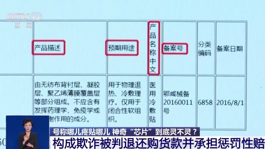 两位老人购买佩戴半个月后,发现并没有什么用,这才和来看望自己的子女说起,家人看了监管部门核准的产品说明书后发现,这就是一个物理退热、冷敷理疗的普通医用冷敷贴,由凝胶层、聚乙烯薄膜覆盖层等部分组成,并明确标明“不应含有发挥药理学、免疫学或者代谢作用的成分”。怎么看里面都不像有什么高科技的“光量子芯片”。