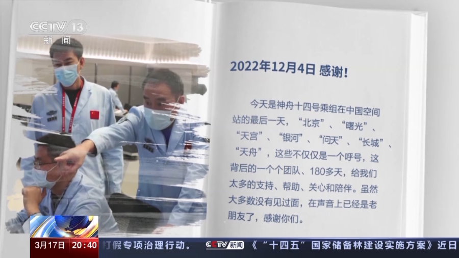 神舟十四号乘组被称为是中国空间站任务实施以来的“最忙太空出差三人组”。在轨驻留的183天里,他们迎来了问天实验舱、梦天实验舱、天舟五号货运飞船以及神舟十五号载人飞船的来访对接,与地面配合完成了中国空间站“T”字基本构型组装建造,并进行了3次出舱活动和1次太空授课。而这些任务完成的背后,有成千上万的航天人在为他们做保障。在神舟十四号乘组即将返回地球的前一天,刘洋在自己的太空日记里,写下了对他们的感谢。