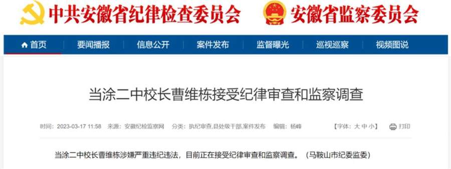 据安徽纪检监察网3月17日通报,当涂二中校长曹维栋涉嫌严重违纪违法,目前正在接受纪律审查和监察调查。此前,安徽当涂县有网友发帖称,“当涂二中一项中标金额488万元的采购项目中,出现了单价3600元的插线板和单价4000元的单灯控制器,两项总价19万元,采购疑似存在成本虚高、萝卜招标。”(3月17日极目新闻)