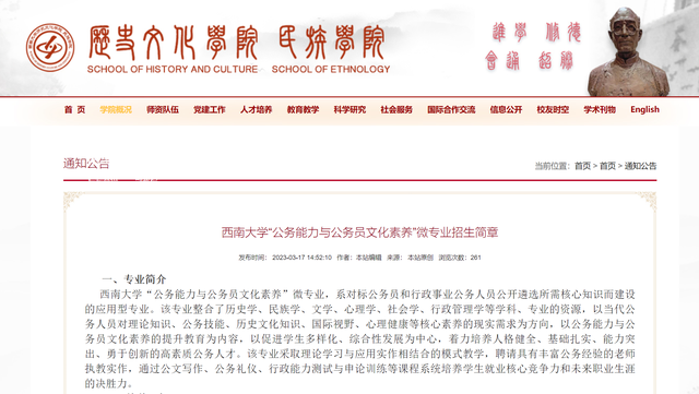 西南大学招生简章称,“公务能力与公务员文化素养”微专业,系对标公务员和行政事业公务人员公开遴选所需核心知识而建设的应用型专业。该专业整合了历史学、民族学、文学、心理学、社会学、行政管理学等学科、专业的资源,以当代公务人员对理论知识、公务技能、历史文化知识、国际视野、心理健康等核心素养的现实需求为方向,以公务能力与公务员文化素养的提升教育为内容,以促进学生多样化、综合性发展为中心,着力培养人格健全、基础扎实、能力突出、勇于创新的高素质公务人才。该专业采取理论学习与应用实作相结合的模式教学,聘请具有丰富公务经验的老师执教实作,通过公文写作、公务礼仪、行政能力测试与申论训练等课程系统培养学生就业核心竞争力和未来职业生涯的决胜力。