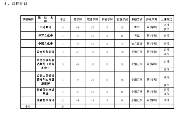 学制1年共两学期。第一学期开展文化基础课程教学,包括申论概论、世界文化史、中国文化史、创新哲学导论等课程;第二学期开展素质拓展与能力培养课程教学,包括行政能力测试基础、公文写作、公务交流与表达规范(公务礼仪)、公职人员情绪管理与心理健康维护等课程。