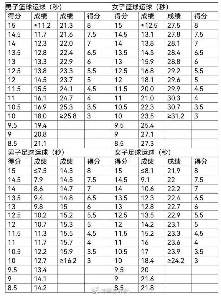 篮球运球、足球运球、1分钟跳绳评分标准按照2007年制定的《国家学生体质健康标准》执行,立定跳远按2014年修订的《国家学生体质健康标准》执行。