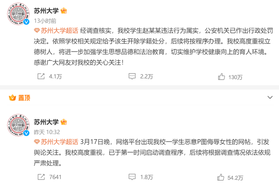 近日网络平台出现苏州大学一学生恶意P图侮辱女性的网帖,引发舆论关注。19日凌晨,苏州大学回应称,经调查核实,该校学生赵某某违法行为属实,公安机关已作出行政处罚决定。依照学校相关规定给予该生开除学籍处分,后续将按程序办理。