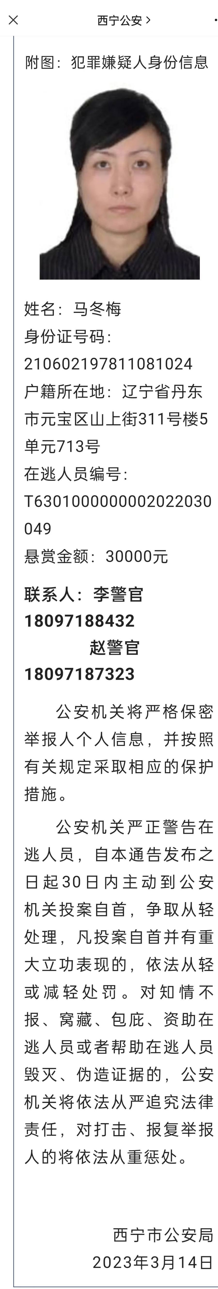 据悉,西宁市公安局经缜密侦查,破获李生彪财物被诈骗案件。经查,发现一个以马冬梅等人为首的盘踞在缅甸的电信网络诈骗犯罪集团,而马冬梅则被公安部列为“拔钉”重点人员。西宁市公安局决定对马冬梅进行悬赏缉捕。凡提供重要线索抓获被追缉对象或直接抓获的,奖励人民币30000元。