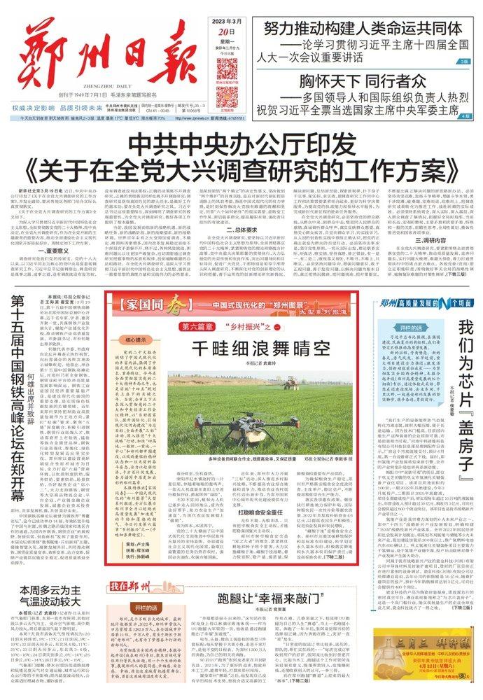 本报特推出【家国同春】——中国式现代化的“郑州图景”大型系列报道,全方位展示郑州市全力以赴跑出高质量发展“加速度”的干劲和蓬勃的朝气。今日刊发第六篇章“乡村振兴”之一《千畦细浪舞晴空》。
