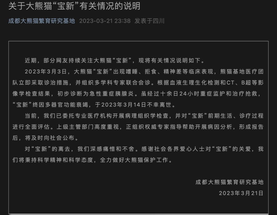 2023年3月3日,大熊猫“宝新”出现嗜睡、拒食、精神差等临床表现,熊猫基地医疗团队立即采取诊治措施,并组织多学科专家联合会诊。根据血液生理生化检测和CT、B超等影像学检查结果,初步诊断为急性重症胰腺炎。虽经过十余日24小时重症监护和治疗抢救,“宝新”终因多器官功能衰竭,于2023年3月14日不幸离世。