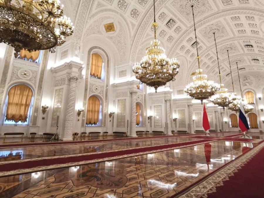 在雄壮激昂的迎宾曲中,习近平主席和普京总统分别从乔治大厅两侧沿红地毯阔步走入大厅中央。