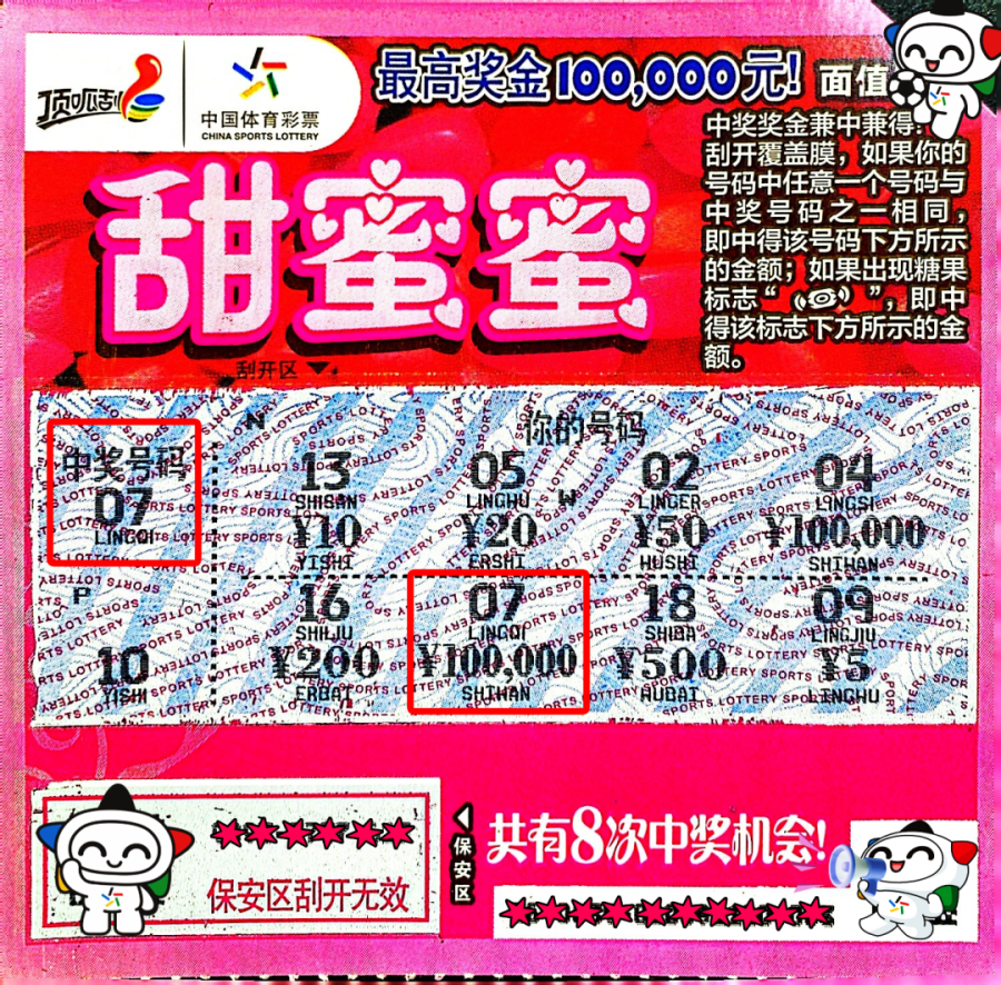 3月14日是王女士生日,男朋友张先生带着她来到体彩实体店,店里展示着多品种的体彩顶呱刮彩票,敞开式展示盒中有两张5元面值的“甜蜜蜜”散票,两人便买来试试手气。当刮至第二张票时,看着中奖号码07下方的奖金数字100000,两人不敢相信,再三确认后又请代销者帮忙一起再次核对,确定是中得了体彩顶呱刮“甜蜜蜜”一等奖10万元奖金。两人又惊又喜。好运就这样降临到了自己身上,又是“甜蜜蜜”这款票,非常映衬这对情侣的甜蜜爱情!