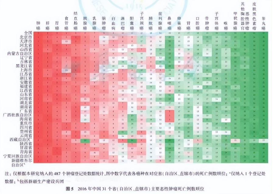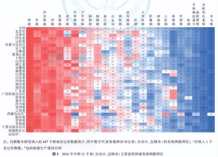 31个省(自治区、直辖市)恶性肿瘤发病率 来源:中华肿瘤杂志