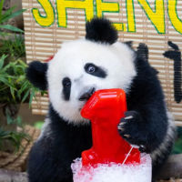 2022年1月14日,在马来西亚吉隆坡附近的马来西亚国家动物园,大熊猫宝宝“谊谊”品尝生日“大餐”。图/新华社记者 朱炜