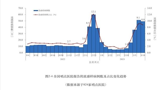 中国疾控中心最新发布的全国新型冠状病毒感染疫情情况显示:2023年第11周(3月13日-19日),全国流感哨点医院流感样病例(体温≥38℃,伴咳嗽或咽痛之一)占门(急)诊就诊人数比值为8.8%,较第10周(3月6日至12日)9.1%的占比已下降了0.3个百分点,成为近五周以来的首次下降。