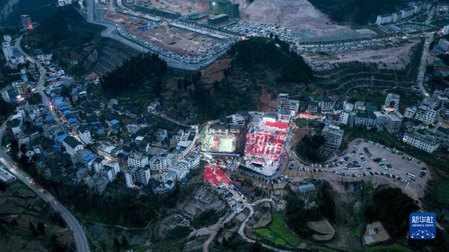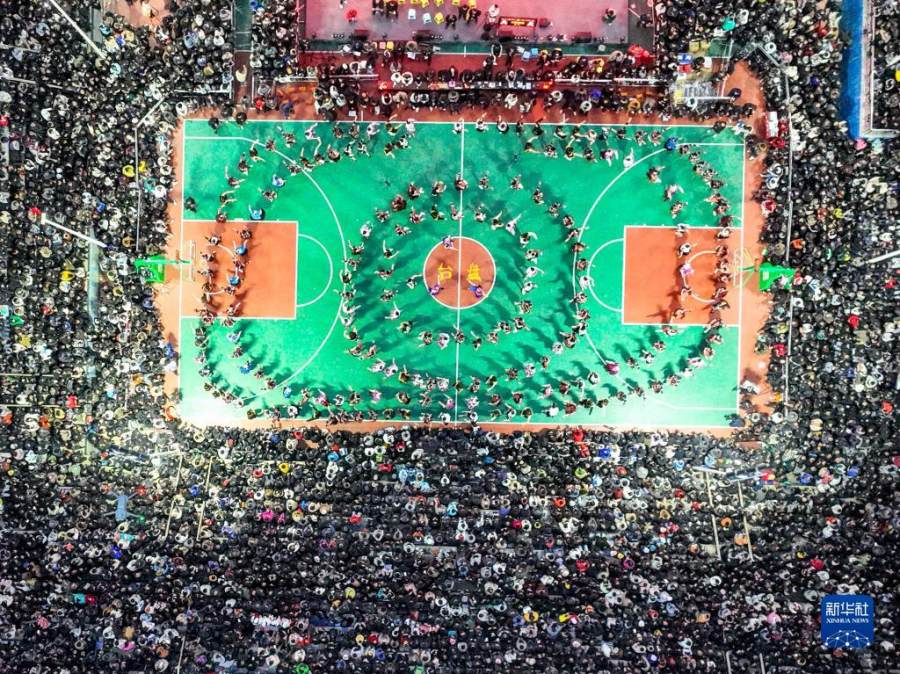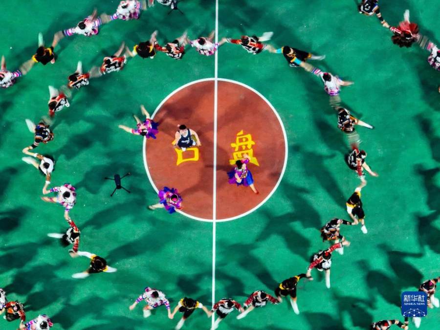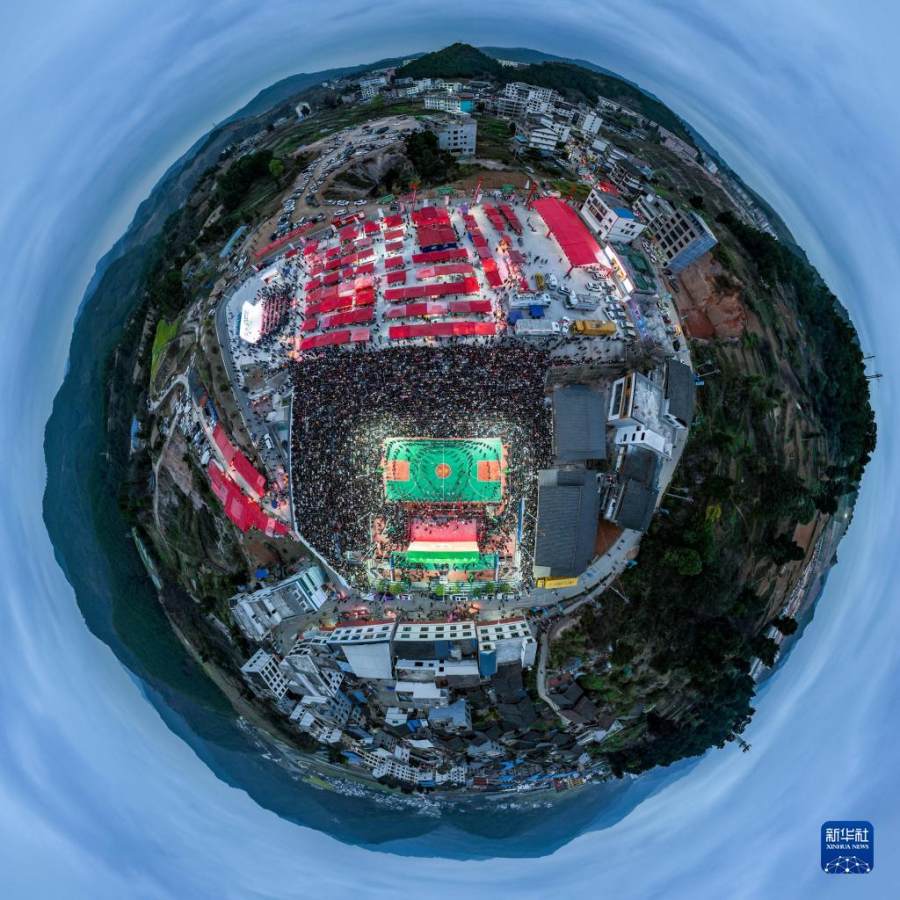 3月26日,比赛开始前,苗族同胞在“村BA”赛场上跳舞(无人机全景照片)。新华社记者 欧东衢 摄