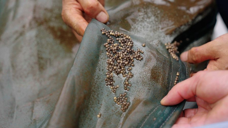 3月26日,科研人员向记者展示着像小蝌蚪一样的小颗粒。这是时隔23年来,长江鲟在天然水域自然繁殖产生的第一批苗,预示着长江鲟野外自然繁殖实验圆满成功。