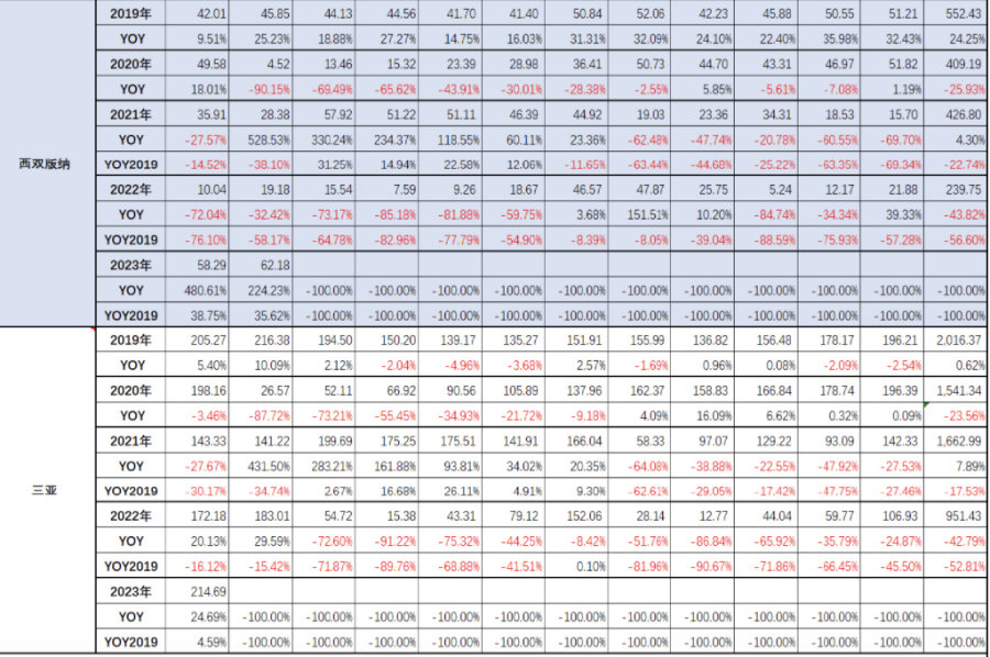 景鉴智库提供了一份2023年机场旅客吞吐量对比数据,西双版纳机场到访人数1月同比增加481%、2月同比增加224%,和2019年同期相比增加38.75%。