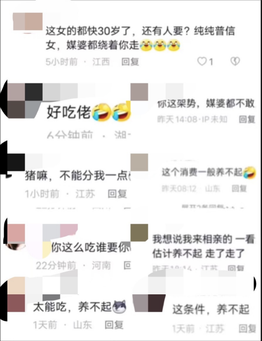 而今年28岁的程序员小韩,只因过年期间晒出自己在老家的楼顶上吃水果,配文“也不知道媒婆啥时候上门”,就有上千条恶评涌进了评论区,“媒婆对这种又懒又爱吃又话多的女人,不敢推荐,还把男的陷进火坑”“ktv、会所提前放假了”“这么能吃谁敢要你”……铺天盖地的恶意,让小韩当天晚上失眠到凌晨三四点。