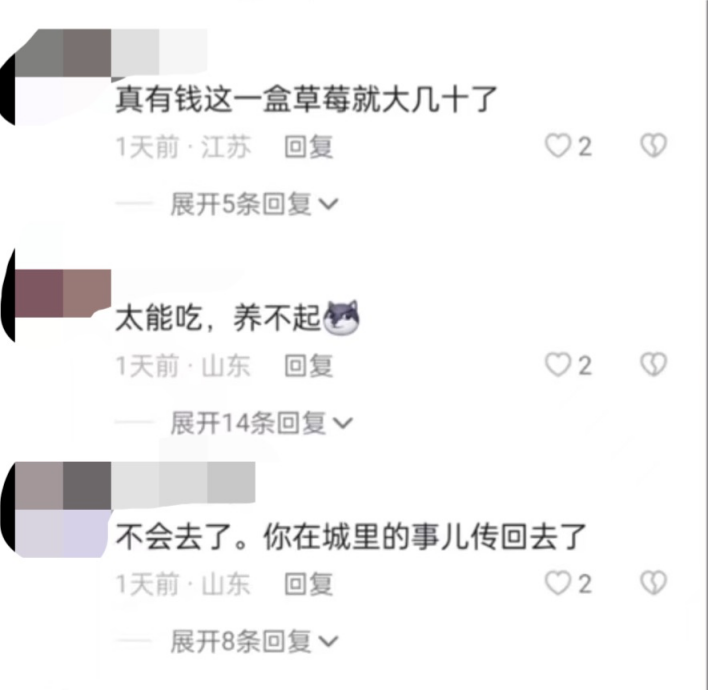 老家不让盖新房子,所以我们家房子看上去比较破,有人骂我说真能吃,说“我们家这么破,不配吃这么贵的”,其实视频里看上去比较贵的草莓和蓝莓价格总计也就二三十元。还有说我“过年回来这么早肯定是特殊职业”,还说在那种特殊的场所见过我,很多造谣的话,甚至还有人骂我全家。