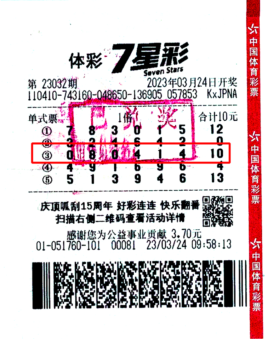 体彩7星彩第23032期,全国中出1等奖一注,由我省郑州市幸运购彩者揽获,奖金500万元,中票为一张机选5注投注彩票。
