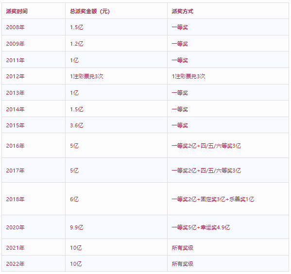 从派奖金额来看,可谓是一路升高,节节开花。2008至2014年,派奖金额基本在2亿元以内;2015年实现突破,派奖金额上涨至3.6亿元;2016至2017年,派奖金额均为5亿元;2018年因“乐善奖”的加入上调至6亿元;2020年则大幅上调至9.9亿元;2021年、2022年,体彩超级大乐透派奖金额持续突破,达到10亿元,力度空前,且2022年派奖还新增了15周年特别奖。体彩超级大乐透派奖频率高、力度大。上市第二年,就开始进行大派奖活动,一路为购彩者派送惊喜。