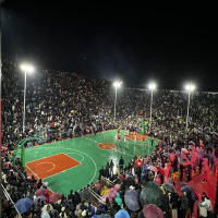 据张任泉介绍,因对篮球比赛的热爱,2015年起,经过台盘村委几次向台江县政府申请与当地村民自愿捐献筹集,修建篮球场的资金就这样逐渐凑了大半,一座颇具规模的篮球场也逐渐搭建了起来。自2022年“村BA”爆火出圈后,因太受群众欢迎,台盘村又对篮球场做了扩增,新建了媒体招待室、球员教练裁判休息室,并将看台座位从1万扩增到2万个。可尽管今年扩增了这么多座位,但依然不能完全容纳所有的观赛人员,不得已,台盘村在小吃街尽头临时搭建了一个LED屏幕,实时播放现场比赛,不完全统计大概有3千余人如此观赛。