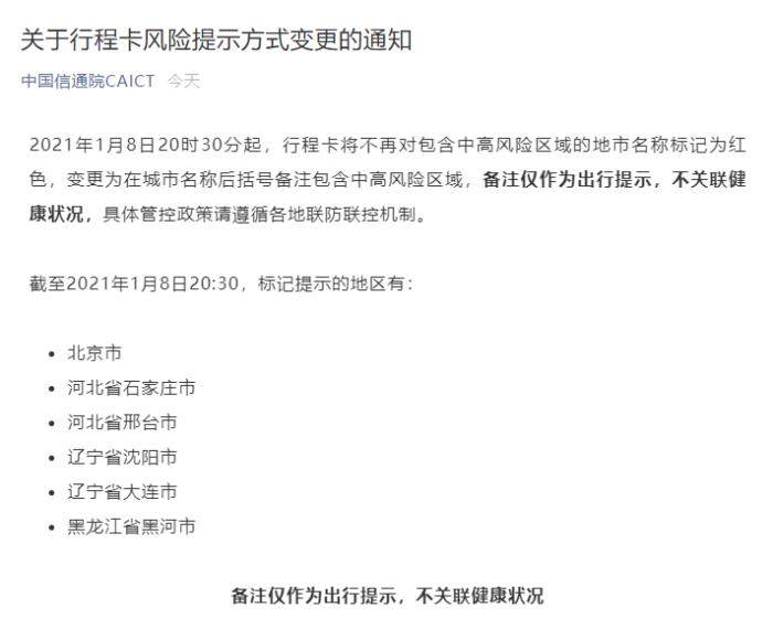 中新网1月8日电(吴涛) 据“中国信通院CAICT”8日晚公布, 2021年1月8日20时30分起,行程卡将不再对包含中高风险区域的地市名称标记为红色,变更为在城市名称后括号备注包含中高风险区域,备注仅作为出行提示,不关联健康状况,具体管控政策请遵循各地联防联控机制。