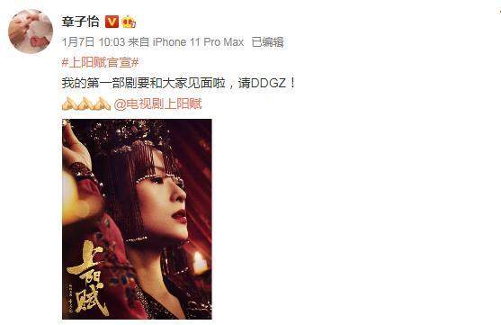 1月7日,章子怡发微博为自己的电视剧《上阳赋》宣传,片方也先后发布了角色预告片及主题曲,这部于几年前杀青且经历了多次改名的剧,即将于1月9日正式开播。