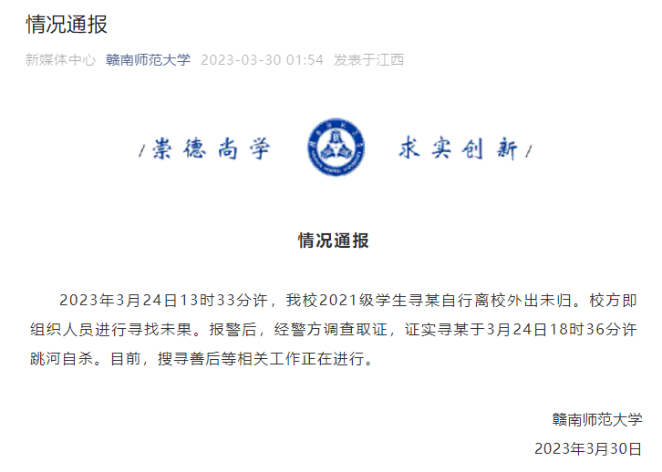 3月30日凌晨,江西赣南师范大学发布通报,3月24日13时33分许,该校2021级学生寻某自行离校外出未归。校方即组织人员进行寻找未果。报警后,经警方调查取证,证实寻某于3月24日18时36分许跳河自杀。
