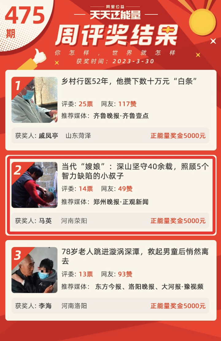 3月30日,在475期阿里巴巴天天正能量评选活动中,“嫂娘”马英荣获正能量奖,奖金5000元。
