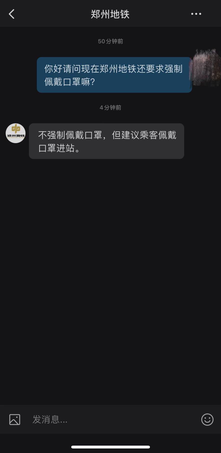 记者通过私信郑州地铁官方微博账号了解到,目前郑州地铁不强制佩戴口罩,但建议乘客佩戴口罩进站。