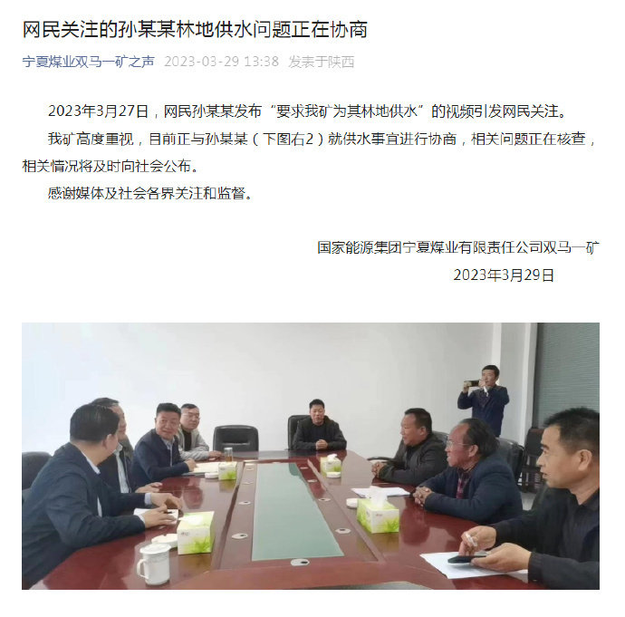 据宁夏煤业双马一矿之声微信公众号:2023年3月27日,网民孙某某发布“要求我矿为其林地供水”的视频引发网民关注。我矿高度重视,目前正与孙某某就供水事宜进行协商,相关问题正在核查,相关情况将及时向社会公布。
