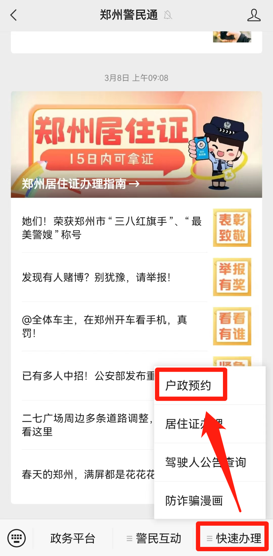 在郑州警民通“快速预约”栏选择【户政预约】;