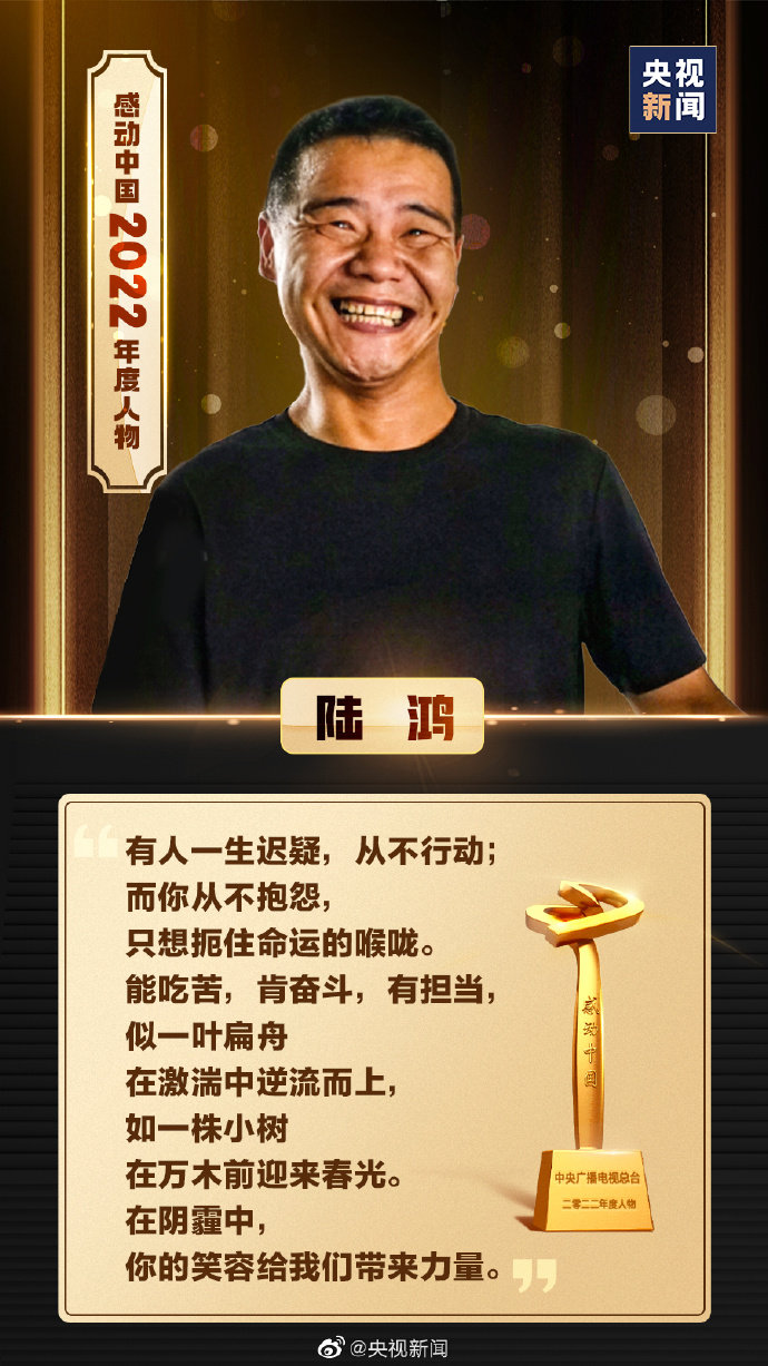 “有人一生迟疑,从不行动;而你从不抱怨,只想扼住命运的喉咙。能吃苦,肯奋斗,有担当,似一叶扁舟在激湍中逆流而上,如一株小树在万木前迎来春光。在阴霾中,你的笑容给我们带来力量。”这是感动中国组委会给陆鸿的颁奖词,短短80余字,却概括了陆鸿的传奇故事。
