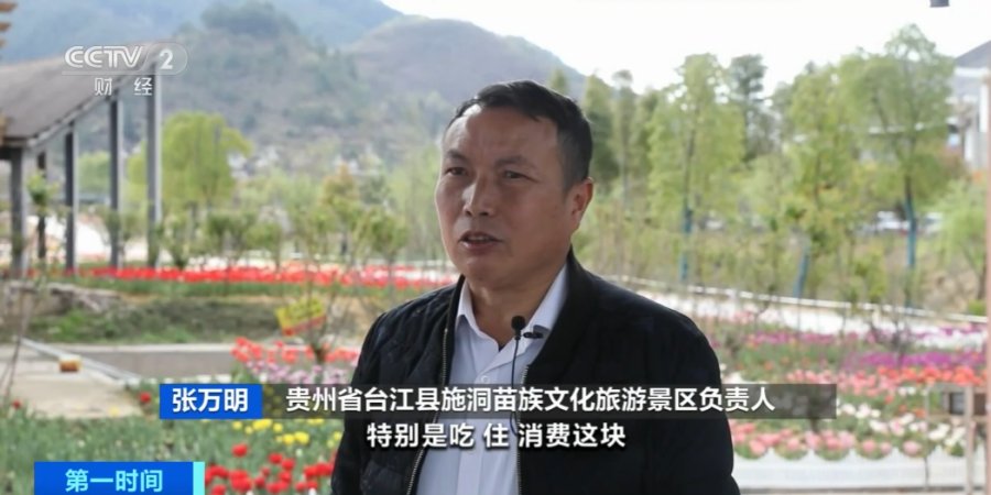贵州省台江县施洞苗族文化旅游景区负责人 张万明:在“村BA”的带动下,很多游客到景区游玩,特别是吃、住、消费这方面,游客除了赏花,体验苗族风情以外,还购买了当地的苗族银饰、刺绣、剪纸等苗族特色产品。