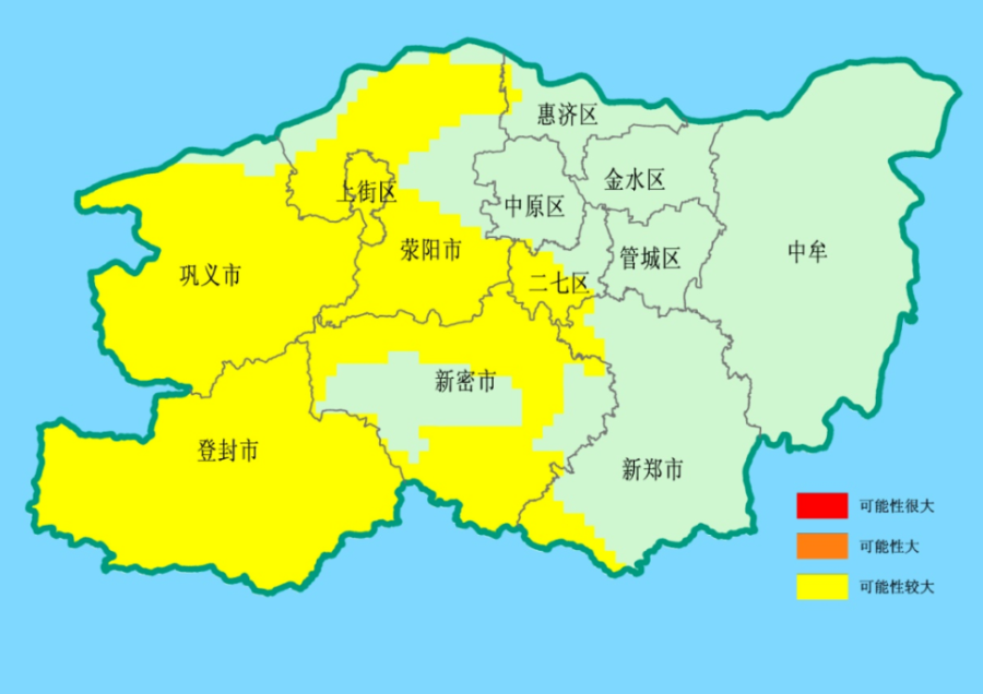 今晚到明天,郑州市地质灾害气象风险预警达到黄色预警的地区为:登封、巩义、荥阳、上街、新密、二七区大部,新郑西北部及西南部,惠济区西部,发生地质灾害的可能性较大。