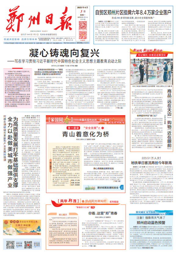 党的二十大报告阐明了中国式现代化的丰富内涵,强调了中国式现代化的本质要求、重要特征。今年是全面贯彻落实党的二十大精神开局之年,也是实施“十四五”规划承上启下的关键之年。当前,全市上下正在深入贯彻党的二十大和全国两会精神,以“当好国家队、提升国际化、引领现代化河南建设”为总目标,全面开展“三标”活动、深入推进“十大战略”行动,加快“四高地、一枢纽、一重地、一中心”和郑州都市圈建设,以风雨兼程的精神状态和一往无前的奋斗姿态,全力以赴拼经济,千方百计促发展,奋力谱写中原更加出彩的郑州篇章。